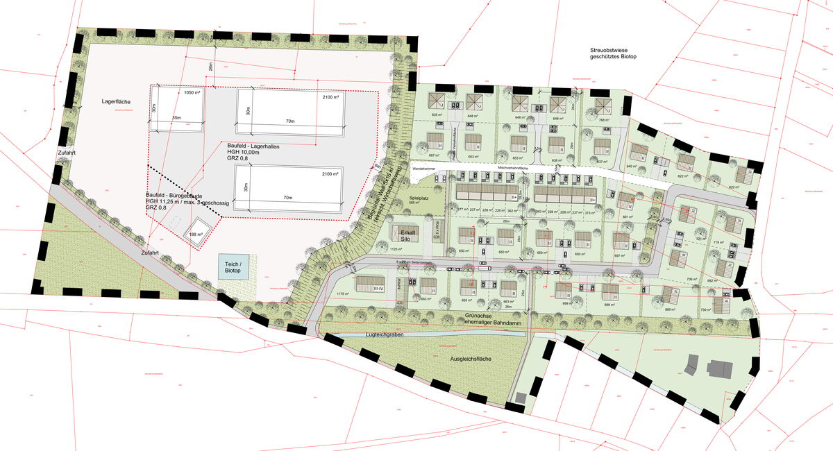 Das Gewerbegebiet der ehemaligen Getreidetrockung, prominent am Eingang zur Herrenleite gelegen, erfährt eine deutliche Änderung seiner Gestalt und Nutzung. Ein Großteil der Fläche wird als Wohngebiet mit dörflicher Prägung und kleiner Orts-Mitte entwickelt. Verschiedenen Wohnformen vom Einzel- bis zum Reihenhaus prägen den neuen Ortsteil. Durch die topografische Bevorzugung am Südhang und die Einflechtung großzügiger Grünbänder gelingt ein Anklang an die Gartenstädte des Anfangs des 20. Jahrhunderts.