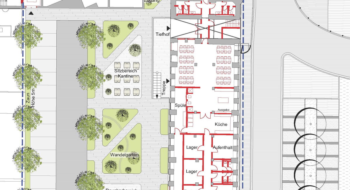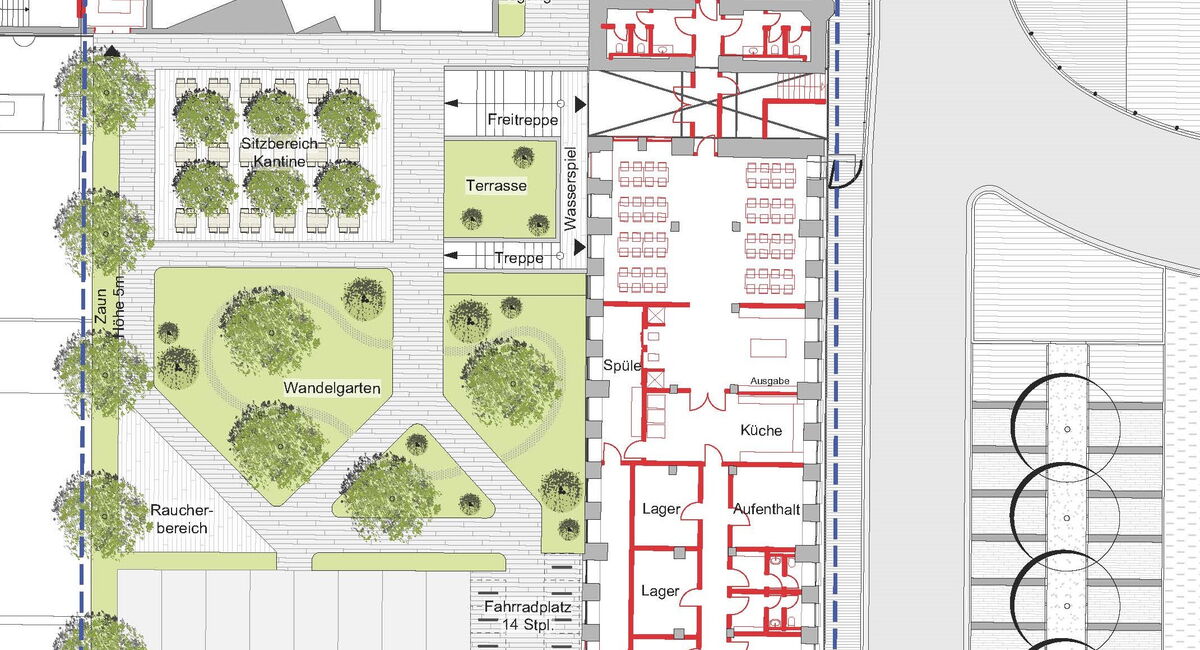 Das Integrierte Verwaltungszentrum wird erweitert und soll den Behörden von BAMF und LDS ein neues Dach über dem Arbeitsplatz bieten. Um eine gestalterische Einheit zu bilden, führen wir die Form- und Materialsprache weiter und setzen dennoch eigene Akzenkte. Als einziger Abschnitt der neuen Zentralen Ausländerbehörde öffnet sich der Haupteingang zum öffentlichen Raum und wird dafür mit besonderen Materialien und einer großzügigen Gestaltung belohnt. Später wieder unter den Oberflächen versteckt, aber für die Funktion wichtig, werden die Ver- und Entsorgungsmedien einschließlich der Regenrückhaltung ertüchtigt und umgebaut.