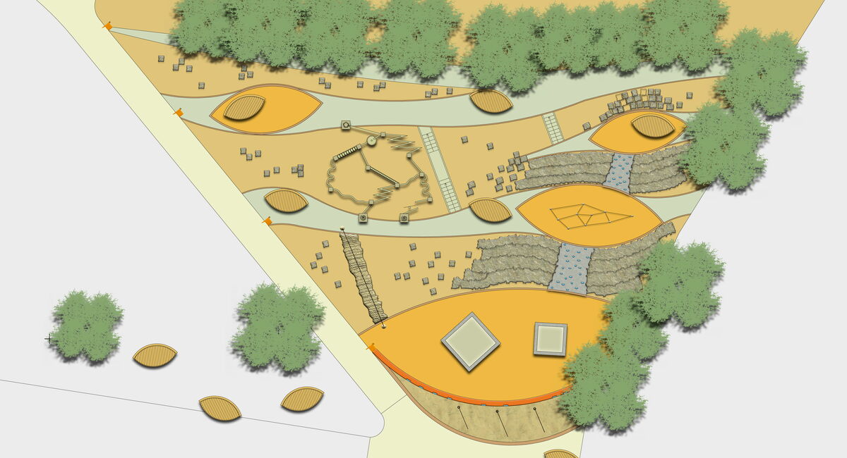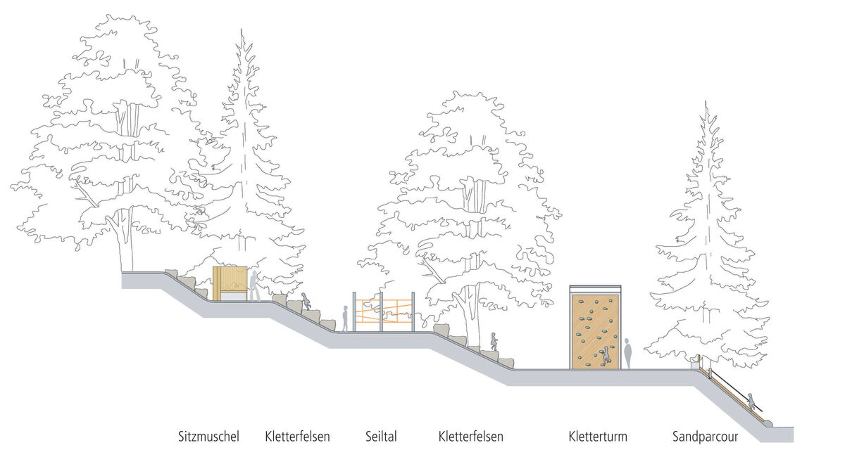 Die Entwurfsidee für den Kletterhang entwickelt sich aus den natürlichen Gegebenheiten und dem Anspruch, ein Angebot zu schaffen, welches alle Altersgruppen und Leistungsniveaus gut anspricht. Dabei werden die Bedürfnisse von Touristen und Einheimischen gleichermaßen berücksichtigt. So stehen Felswände, Sandparcour, Klettertürme und Seilanlagen auf verschiedenen Ebenen zur Verfügung. Zudem ist Geschicklichkeit gefragt, durch mehrfaches Begehen wird diese gefördert. Über den ganzen Hang verteilt bieten Sitzmuscheln einen Rückzugsraum. Und nicht nur von Kindern wird die Murmelbahn mit vielen Einzelelementen und Kreuzungen angenommen werden. Zum Badeingang wird das Gelände durch eine geschwungene Sitzbank abgegrenzt.